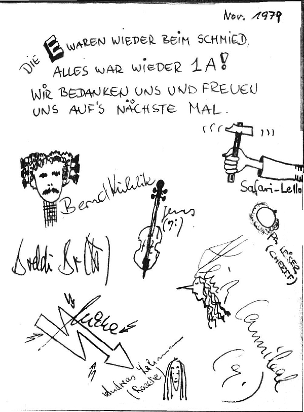 Plakat von Bernd Scheubert (1979) Er war auch "Austatter " von Vroni Fischer und Pankow ( Bühnenbild, Beleuchtung, Fotos) Und weil damals kein Bassist zur Stelle war, blieb ein Sticker weiß (Plakat zur Verfügung gestellt durch Robert Kuhnert aus Weißwasser) |